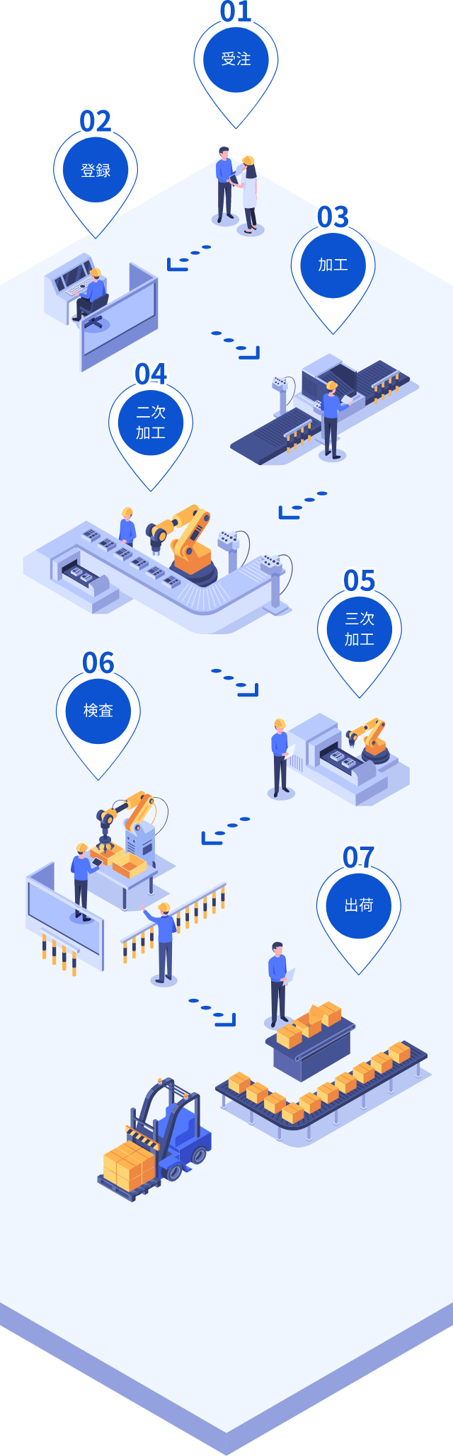 最も効率的な生産計画を立案し、短納期対応の製造業務をコントロールする事で、歩留まり・設備稼働率向上・リードタイムの短縮を図り最適なQ・C・Dの実現を目指しています。また、情報管理のIT化によるデータベースを構築をすることで本来のものづくり業務へ時間を有効に配分し、お客様のご期待により一層お応えできる環境を整えています。